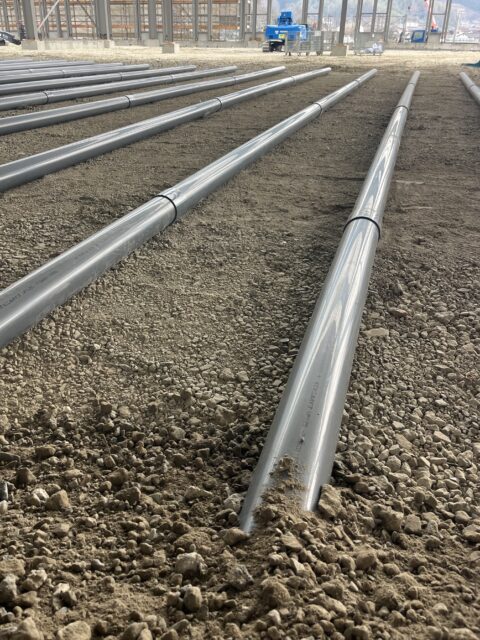 こちらの現場は面積も広く、凍上防止用のパイプを約500本近く配管しています。